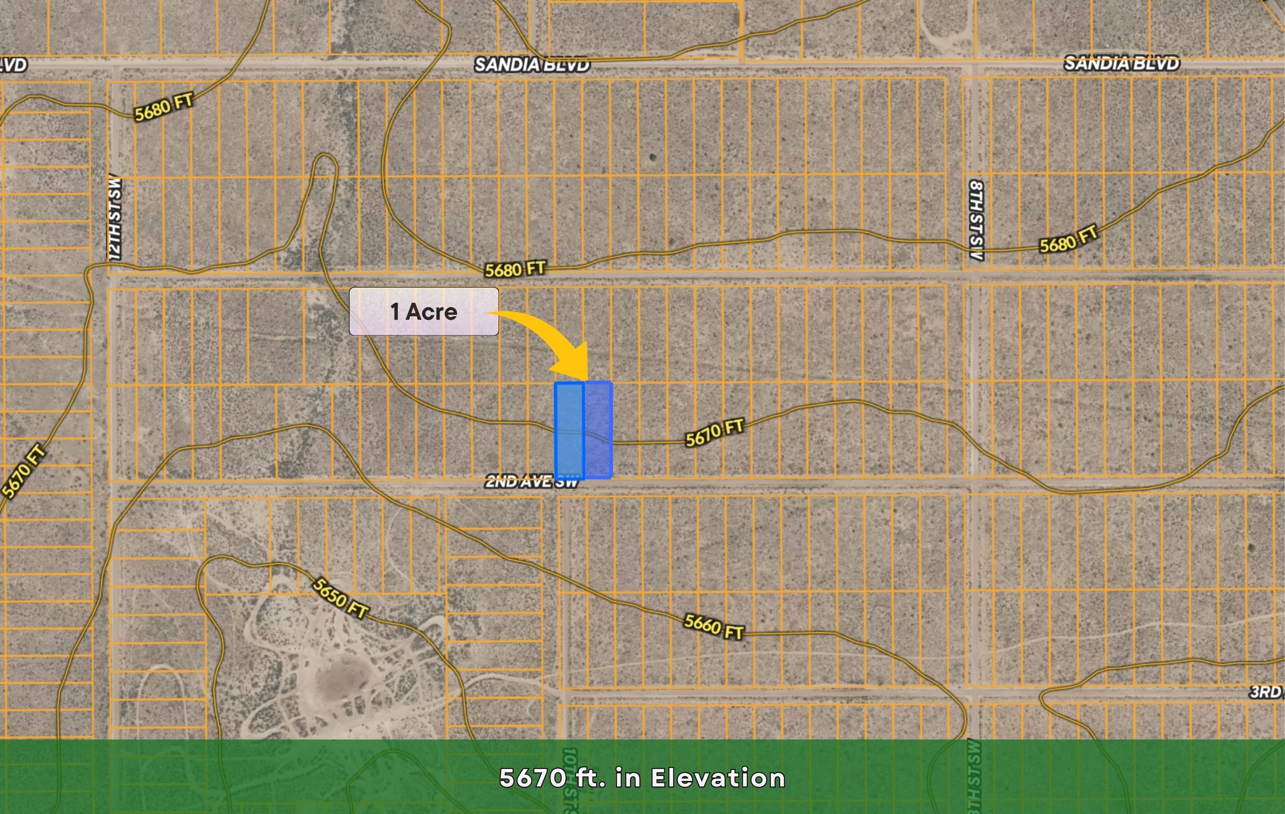 This is a 1-acre vacant parcel combining two lots on 2nd Ave SW in the Rio Rancho Estates subdivision, Sandoval County, New Mexico. At 5,670 feet elevation on the West Mesa plateau, the terrain is flat high desert with open sightlines and the Sandia Mountains visible to the east. The lot sits within a legally platted subdivision with an established street grid. No structures, no utilities, and no HOA on record. Rio Rancho is New Mexico’s third-largest city with a 2025 projected population of 114,424 and the largest numeric population gain of any city in the state since 2020. Between 2022 and 2023 alone, the city’s median household income grew from $78,978 to $85,755. Major employers in the city include Intel, Presbyterian Rust Medical Center, Rio Rancho Public Schools, and the City of Rio Rancho itself.